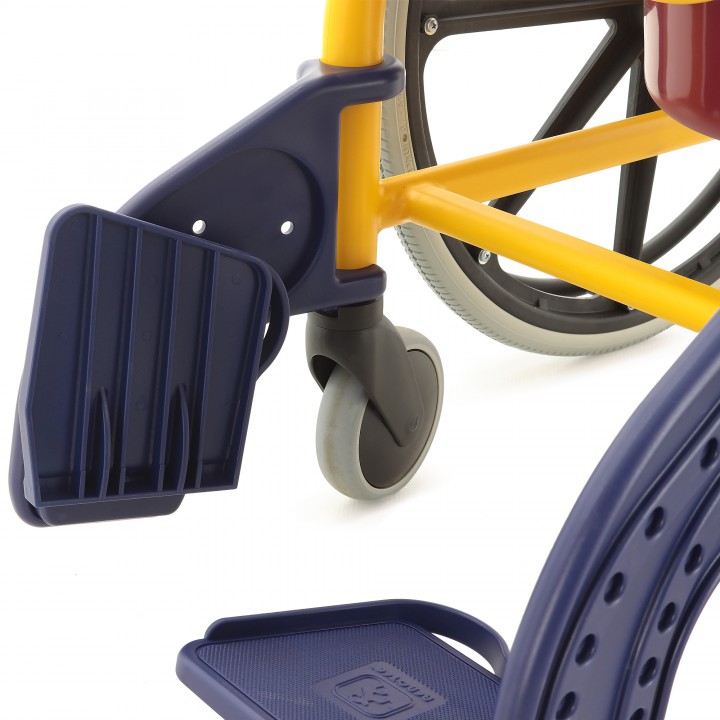 Конструкция полностью разборная, что обеспечивает удобство транспортировки и хранения. Сборка осуществляется при помощи болтов из нержавеющей стали. Каждая опора оснащена колесом, а регулируемые по высоте подножки позволяют адаптировать стул под индивидуальные параметры ребенка.